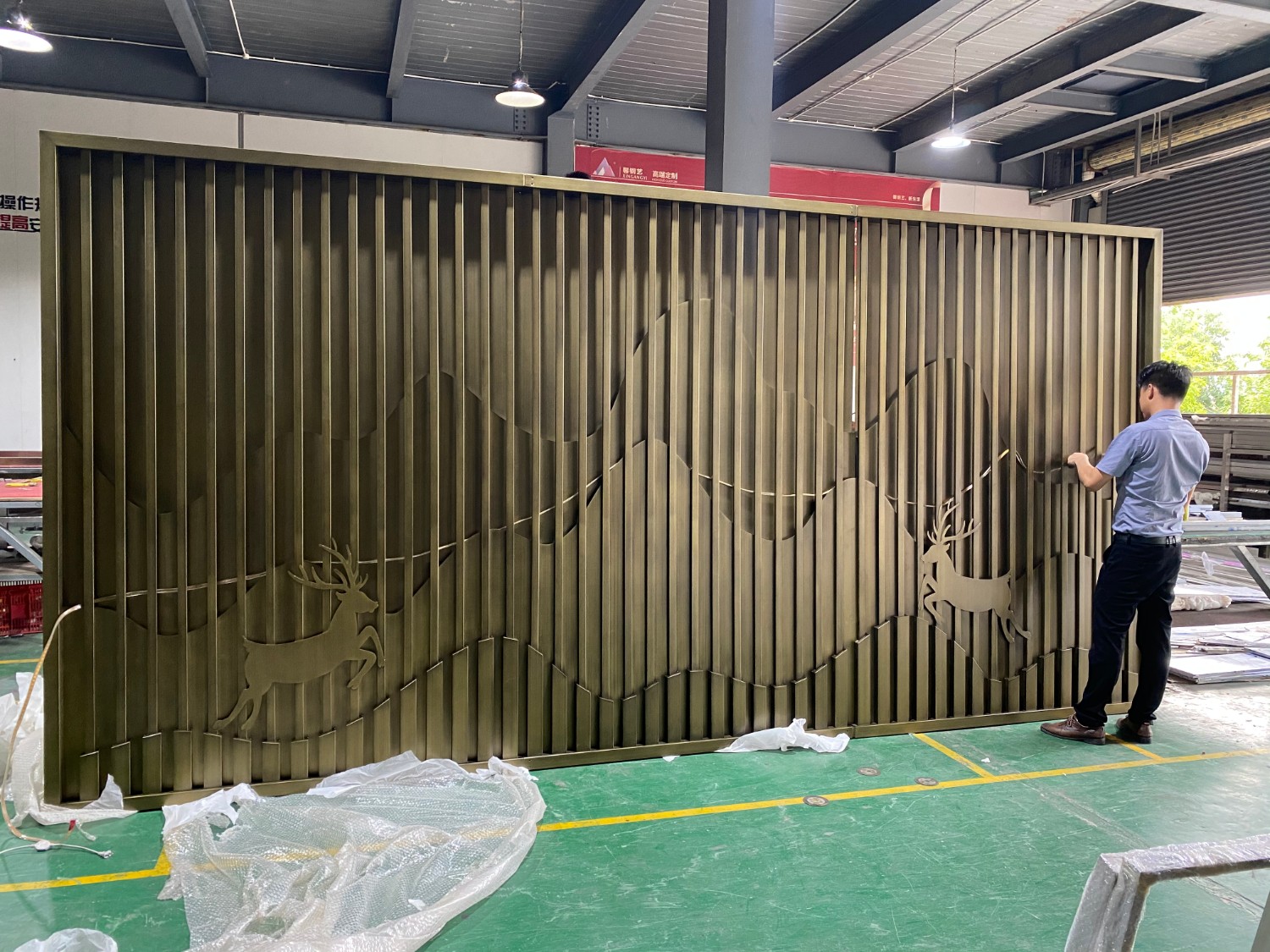 鋁藝影壁墻,端莊大氣,格調(diào)不凡,百年不銹,不開裂,不變形,不褪色,免維護(hù),安裝方便簡單??筛鶕?jù)客戶圖紙要求現(xiàn)定制。